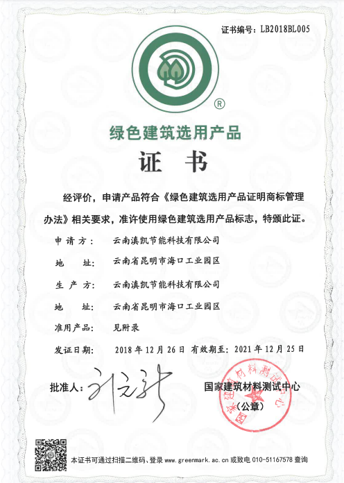 作為業內最權威的綠色建筑產品認證,本次滇凱產品通過認證,不僅彰顯出滇凱公司優良的產品品質,更是國家建筑材料測試中心對滇凱公司產品質量的認可,對滇凱公司堅持綠色發展的肯定。
